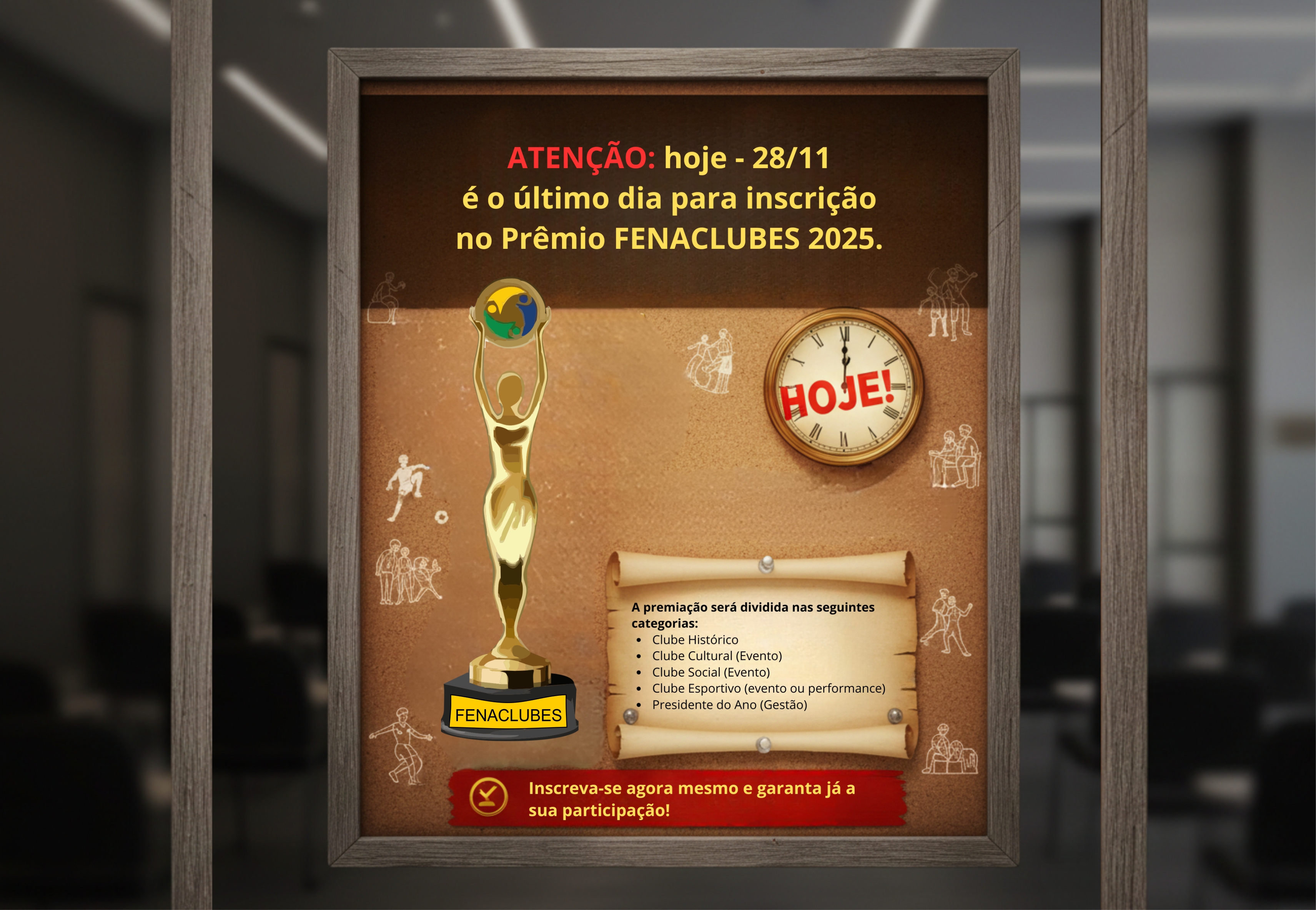 O prazo final para a inscrição no prestigiado Prêmio FENACLUBES se encerra hoje! Esta é a última oportunidade para garantir que seu Clube concorra ao reconhecimento máximo do segmento clubístico nacional.