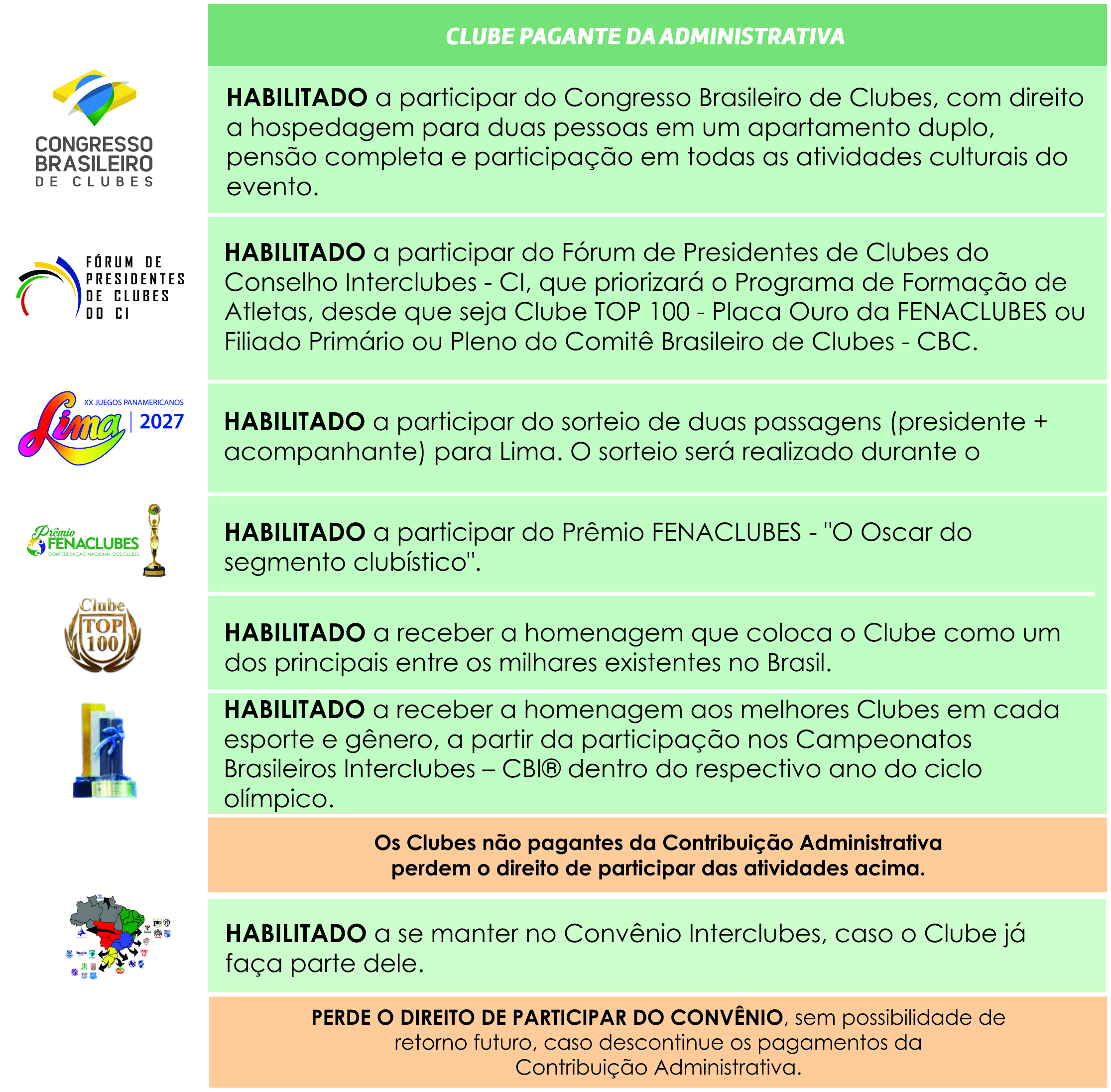 - 2º. Os clubes integrantes do Conselho Interclubes – CI terão suas adesões aprovadas e registradas nas atas das reuniões da Diretoria Executiva e terão direito de participação anual no Congresso Brasileiro de Clubes e no Fórum de Presidentes de Clubes do Conselho Interclubes – CI mediante a adimplência no pagamento das 12 (doze) contribuições administrativas mensais antecedentes à realização dos eventos;