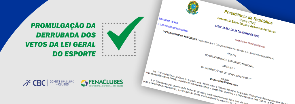 Foi publicada hoje, 22 de maio, a promulgação pelo Presidente da República de trechos da Lei Geral do Esporte (Lei nº 14.597, de 14 de junho de 2023) que haviam sido vetados anteriormente. Este ato, publicado no Diário Oficial da União, oficializa a derrubada dos vetos pelo Congresso Nacional, consolidando avanços significativos para os Clubes.