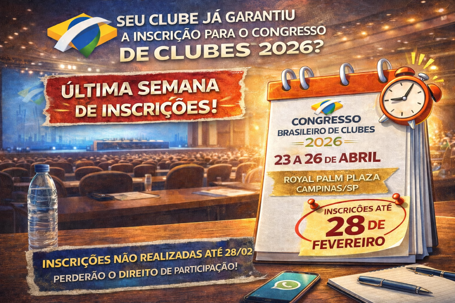 Entramos na última semana de inscrições para o Congresso Brasileiro de Clubes 2026, evento que será realizado de 23 a 26 de abril de 2026, no Royal Palm Plaza, em Campinas/SP, reunindo dirigentes e gestores de clubes em um ambiente de diálogo institucional e troca de experiências.