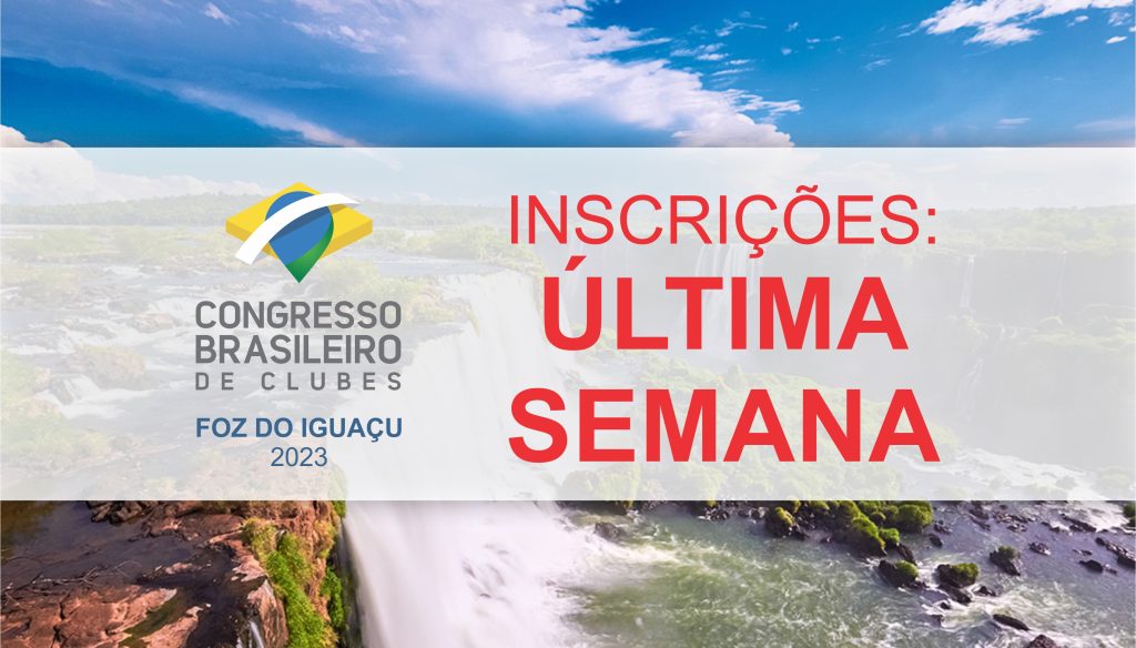 Esta é a última semana para se inscrever no Congresso Brasileiro de Clubes 2023, que acontecerá entre os dias 2 e 5/11, no Hotel Bourbon Cataratas, em Foz do Iguaçu/PR. Este é o maior e mais importante evento de valorização dos Clubes e de seus gestores estatutários, focado na excelência da gestão e no estímulo à integração e a troca de conhecimentos em um ambiente único.