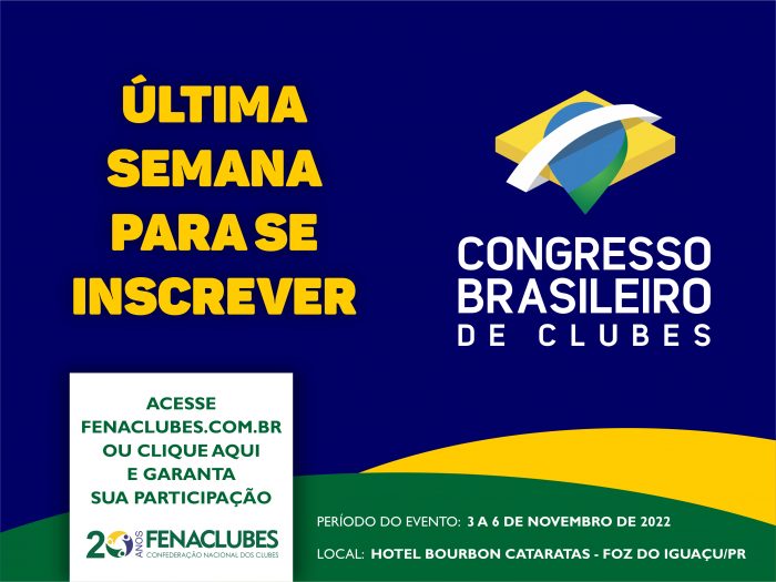 Esta é a última semana de inscrições para o Congresso Brasileiro de Clubes de 2022. Por isso, se ainda não garantiu participação no maior e mais importante evento de valorização dos Clubes e de seus gestores, NÃO PERCA MAIS TEMPO! No período do evento, os Clubes têm direito, gratuitamente, a hospedagem em apartamento duplo, pensão completa (a partir do jantar de 3/11), materiais didáticos e acesso a toda a programação do evento.
